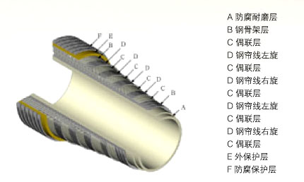 由鋼骨螺旋架層為增強相,鋼絲編織層為增強層,進口高密度聚乙烯為基體,在擠出生產線上成型為多層復合結構的新型防腐耐磨壓力管道。